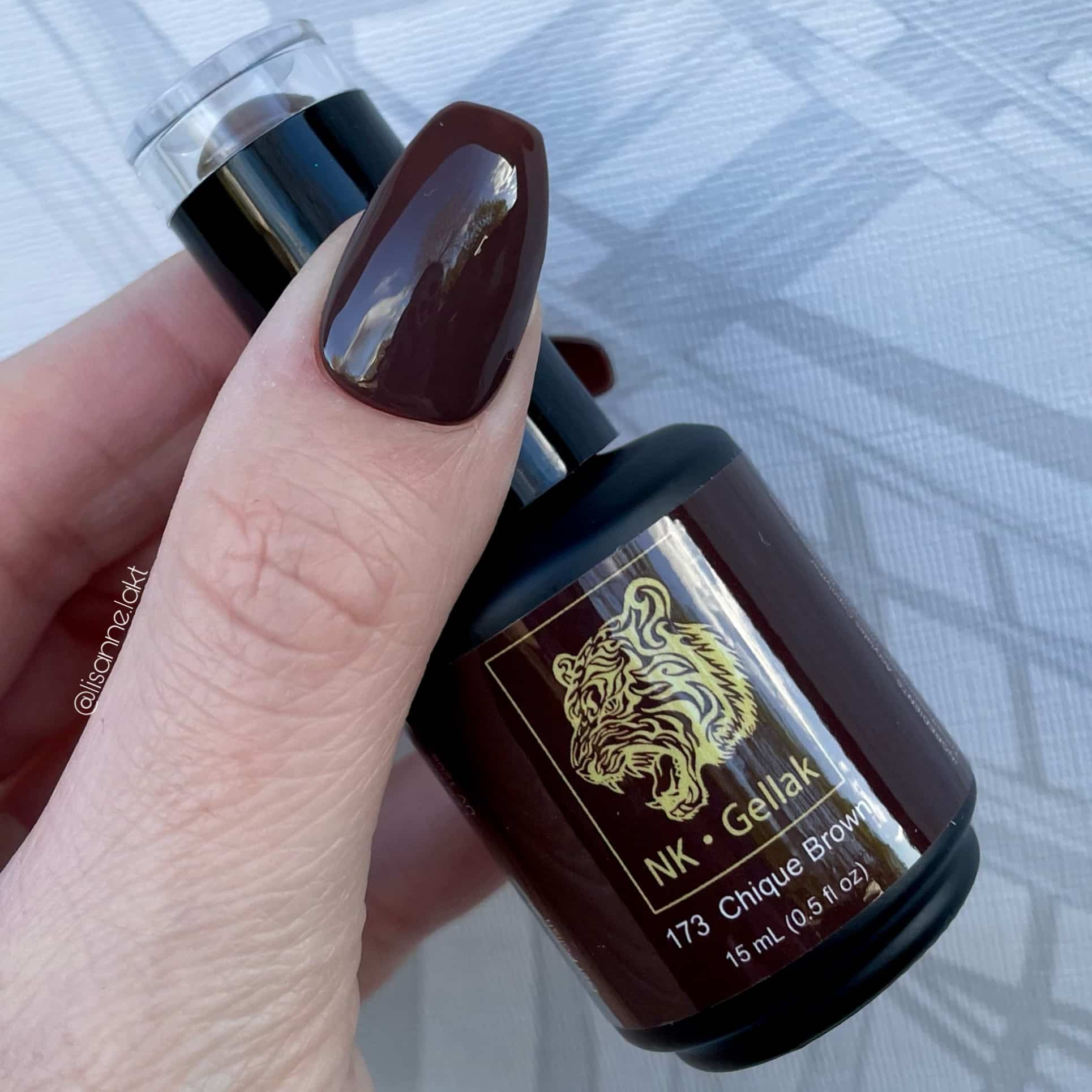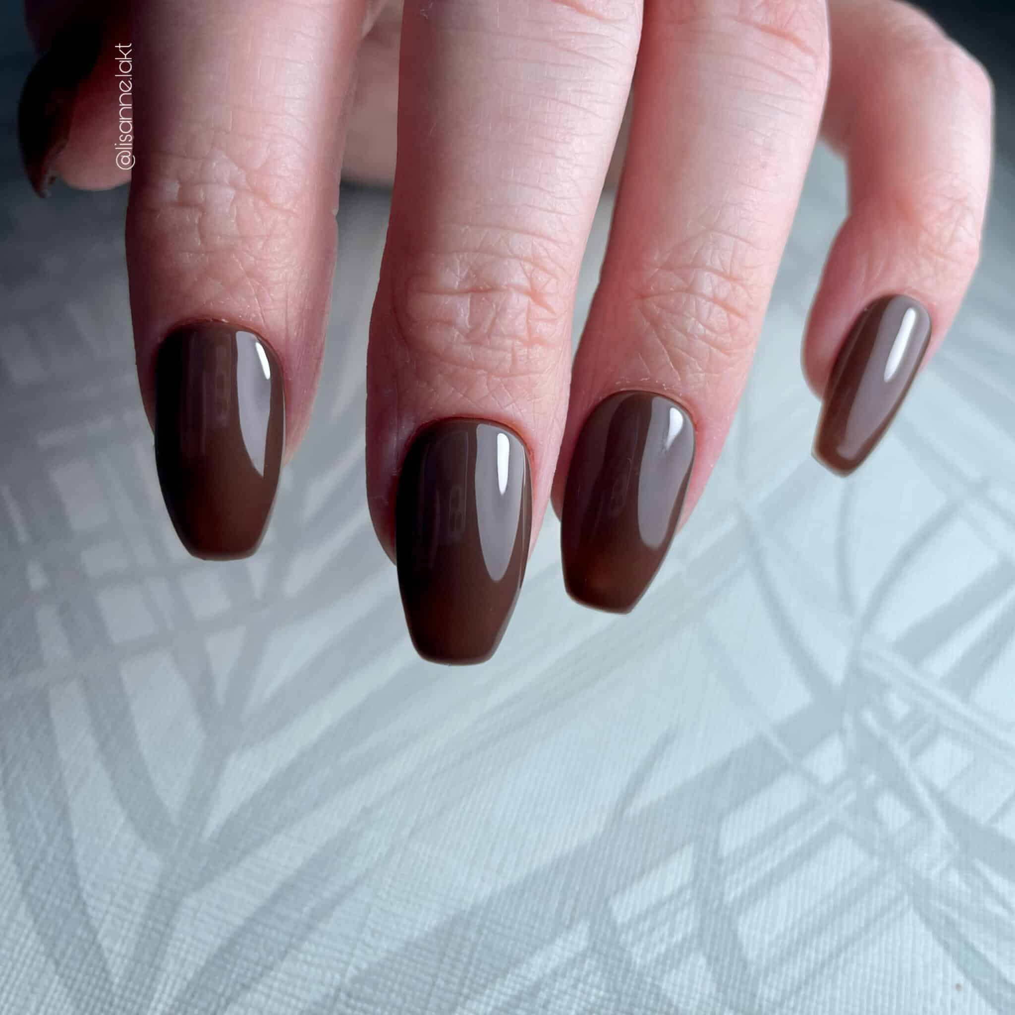 De gellak kleur Chique Brown is een donkerbruine gellakkleur welke lijkt op de gellak kleur Muddy Brown uit onze collectie. De kleur is dekkend in één tot twee laagjes.