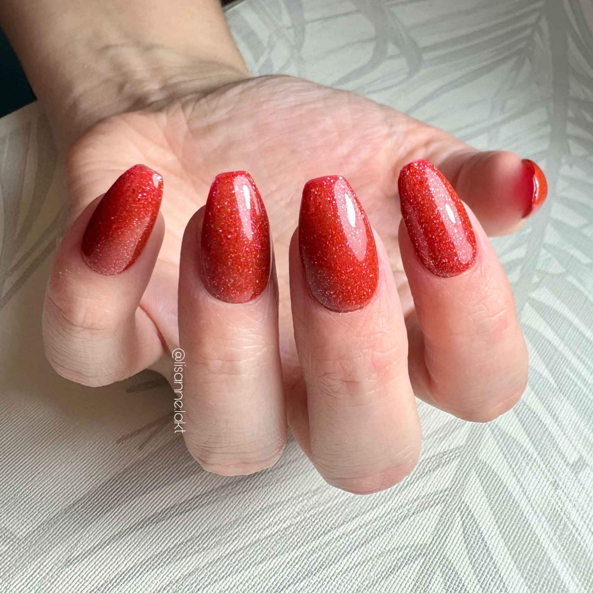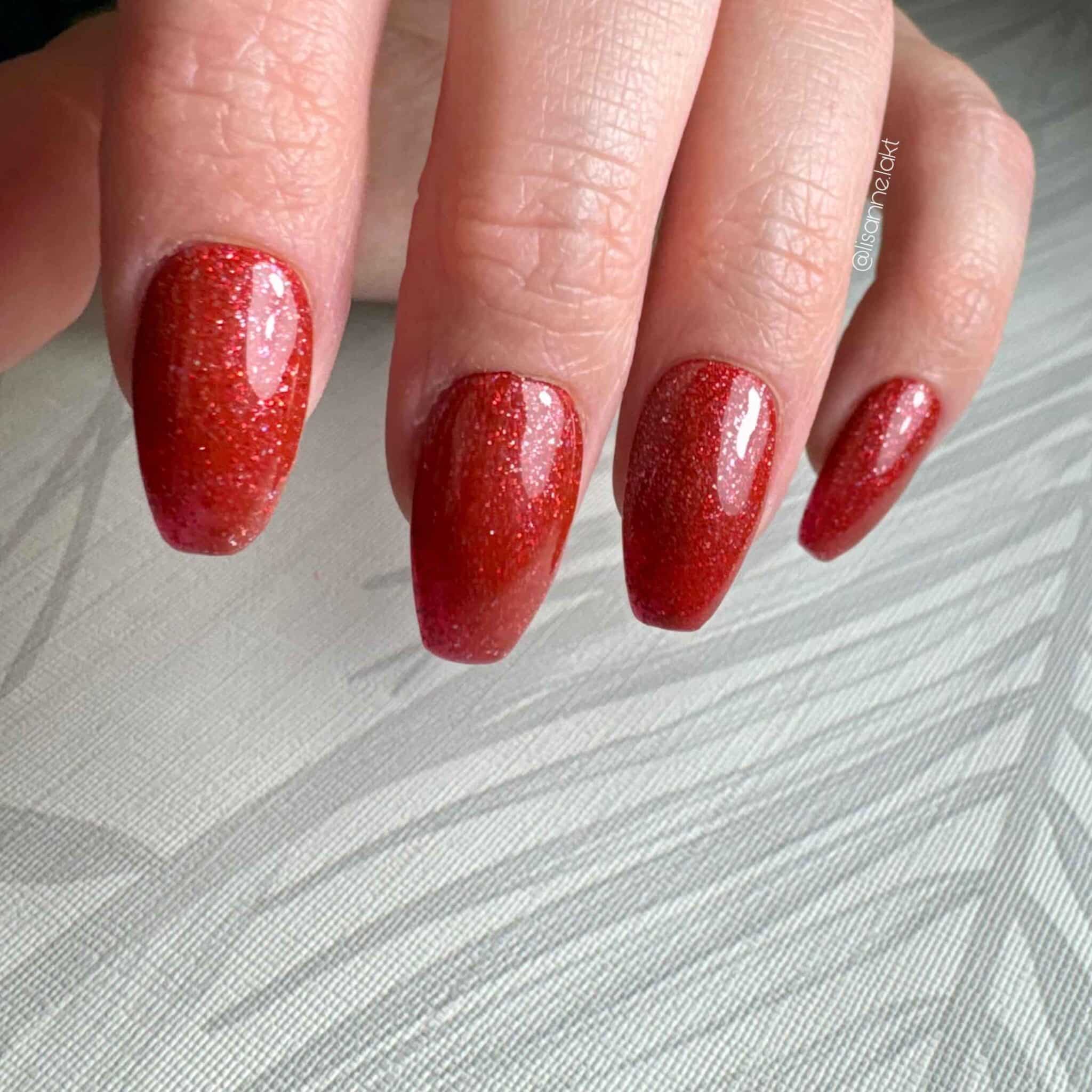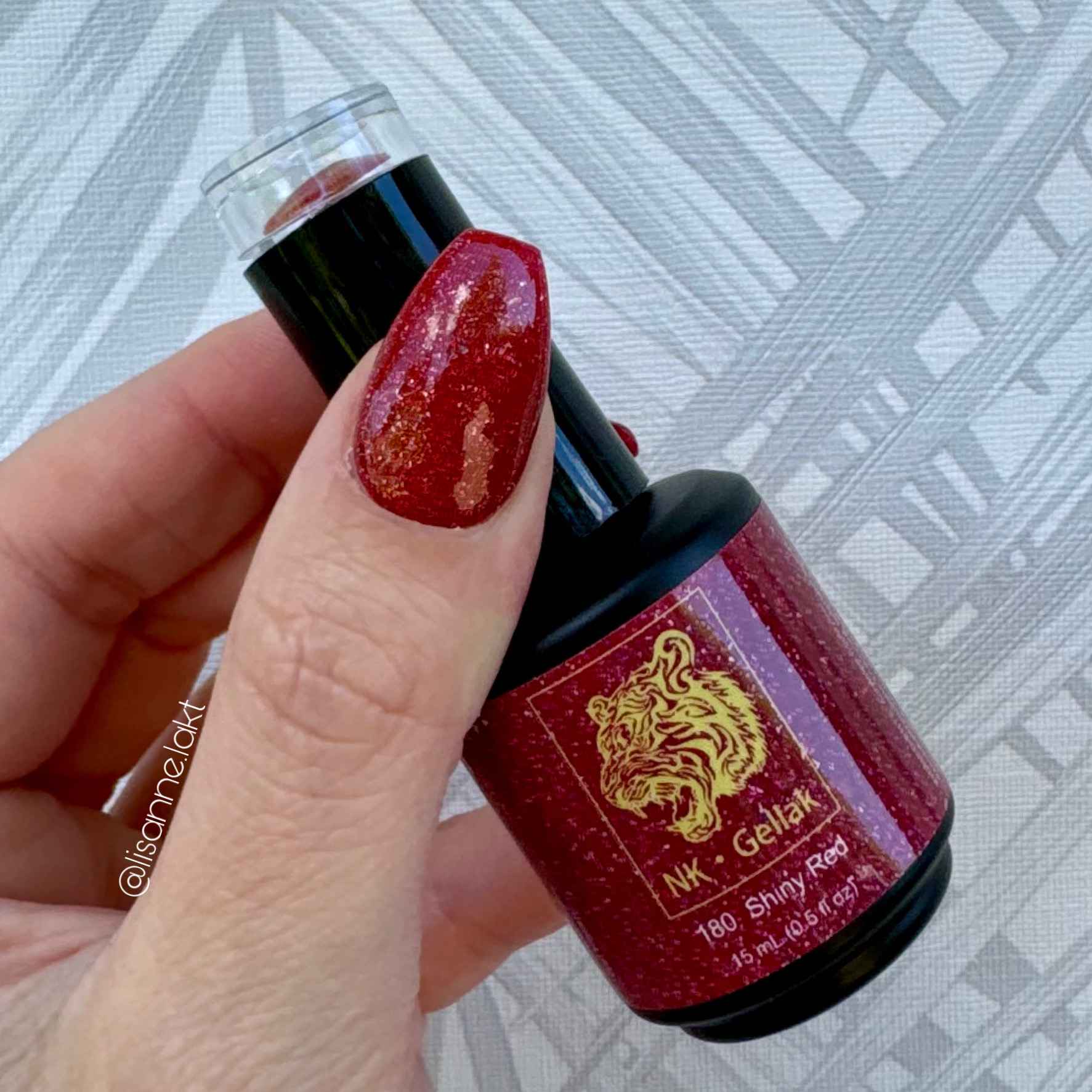 De gellak kleur Shiny Red is de perfecte rode glitterkleur gellak om kerstnagels mee te creëren. De kleur is dekkend in twee tot drie laagjes.